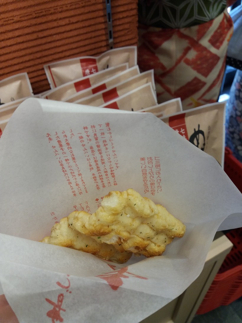 Лавка, в которой их продают, уже побольше, поэтому там убедительно просят есть это там же. Это что-то вроде сухой булки с солью (там было множество различных вкусов). Стоила эта штука около 120 иен (~72 рубля), поэтому я решила попробовать ради интереса.