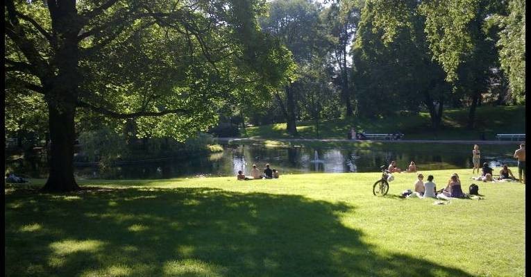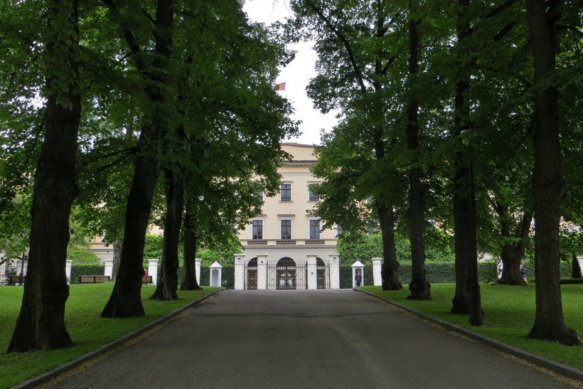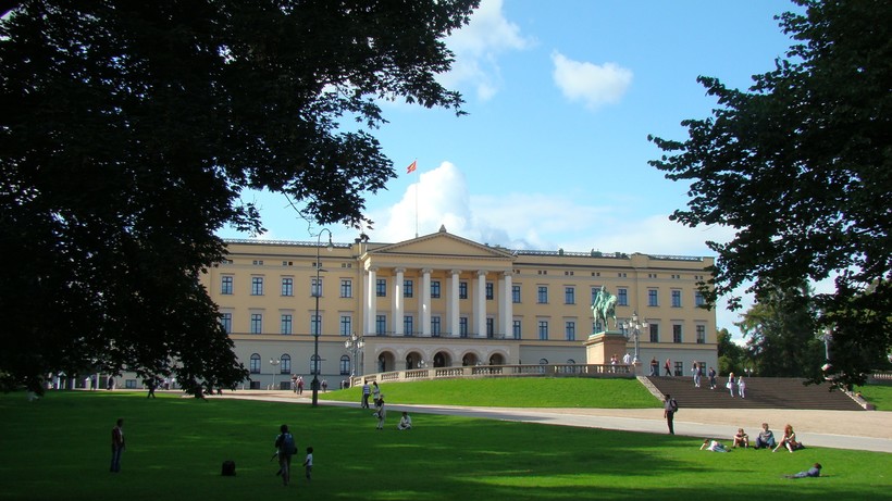 Свою прогулку мы шутливо назвали "в гости к королю". Кстати, в сам дворец тоже можно попасть. Летом туда формируют экскурсии. Мы же пока ограничились прогулкой по парку. Судя, по многочисленности здесь, не только мы. Кроме туристов, в Дворцовом парке есть и сами норвежцы. Их легко узнать по принадлежностям для пикника и отдыха. Да, в парке при королевском дворце можно устроить пикник. Нельзя костры разводить. Группы людей рессеяны по парку неравномерно. Как ни странно, но именно там, где деревья стоят плотнее, несмотря на жару, людей было меньше. Туристические группы же предпочитали держаться поближе ко дворцу. А когда мы прошли чуть далее, пытаясь заглянуть за королевское жилище, то там вообще никого не оказалось.