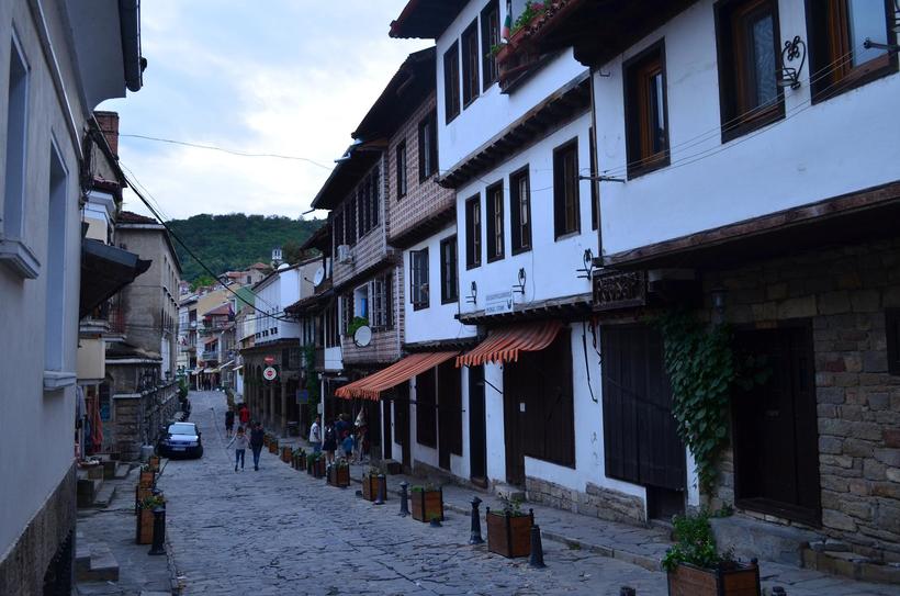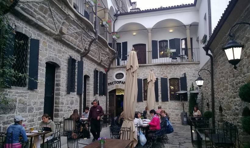 Во время прогулки, мы, залюбовавшись живописными фасадами, не сразу заметили, что за ними иногда скрываются чудесные, милые дворики. Тогда мы стали заходить и в них, получая колоссальное удовольствие. Один дворик нам особенно понравился. Он принадлежит построенной в XIX веке гостинице Хаджи Николи, одному из самых красивых зданий Велико-Тырново. Считается, что архитектора, строившего гостиницу, вдохновляли венецианские дворцы. Глядя на его творение, можно с этим согласиться. Дом недавно прошел реставрацию, в нем был устроен солидный ресторан. Он нам тоже понравился, по окончании экскурсии по городу мы специально вернулись в Самоводску Чаршию, чтобы поужинать в исторической обстановке.