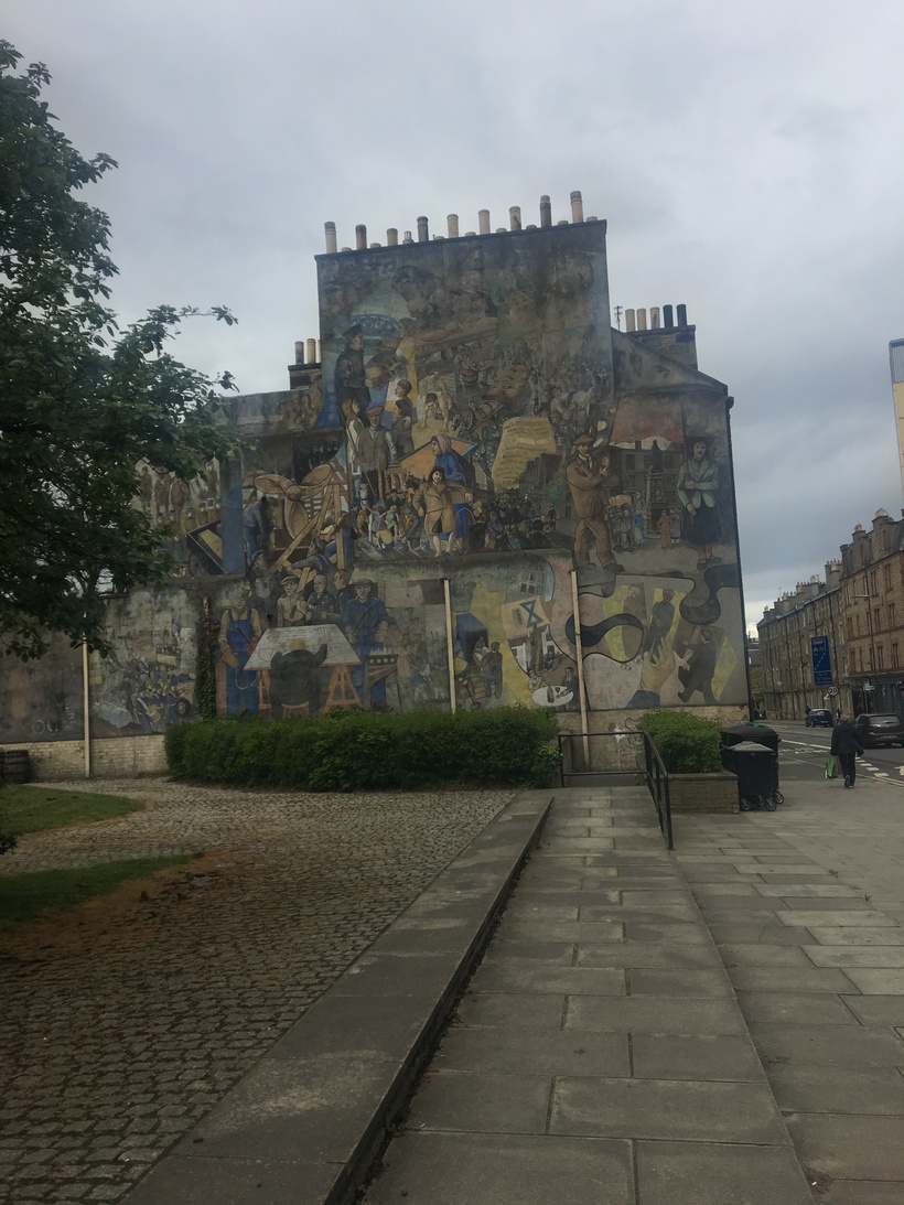 Но контраст жизни жителей Эдинбурга и москвичей был такой разительный, что прогулка принесла мне массу впечатлений. На улицах района совсем нет машин, очень мало прохожих, вокруг цветущие деревья и цвета, разные в каждом палисаднике. Просто отдых для глаз и души после Московского метро. Так я дошла до парка Виктория, на карте он обозначен большим зелёным прямоугольником. А вот дальше мне попалось здание с необыкновенной картиной на стене.