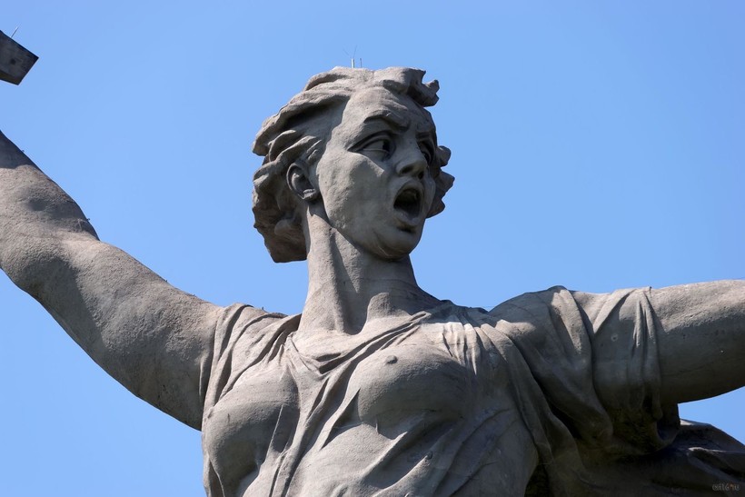 Лицо женщины искажено, ее рот и глаза широко открыты. Но я нашла информацию, что когда скульптор Вучетич, автор мемориала, пояснил, что она кричит "За Родину". И рвущаяся в бой женщина вовсе и не должна выглядеть эстетично и привлекательно.