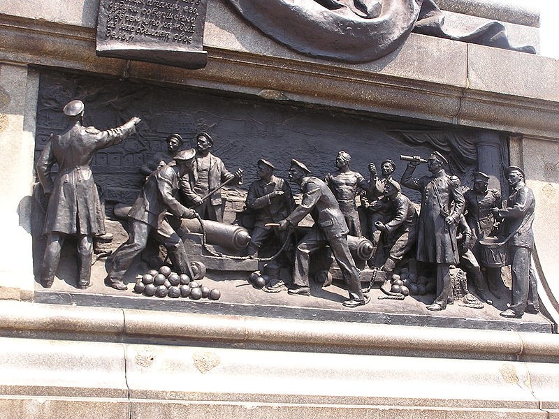 Перейдя площадь (и чуть было не попав под машину, несшуюся куда-то почти со скоростью света), мы с интересом изучили барельефы, которыми украшен пьедестал памятника. На них изображены самые важные события жизни П.С. Нахимова, в том числе битва при Синопе и оборона Малахова кургана.