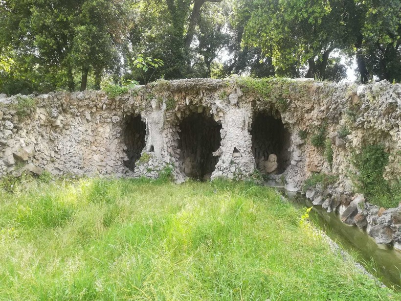 Чуть дальше от фонтана - загадочный грот, можно рассмотреть, если приглядеться, сохранившиеся контуры лепных украшений.