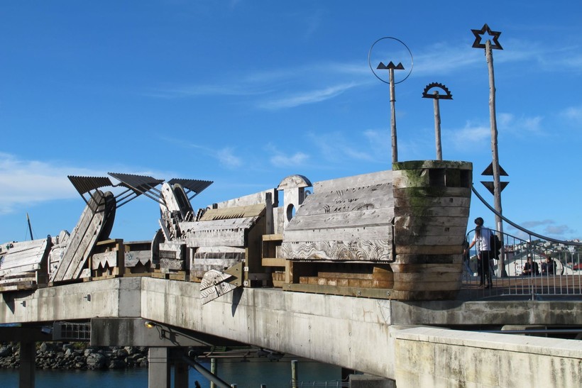 Только необычный. Мост сделан в виде лодки маори и представляет собой такую, скажем, интерактивную штуку... Короче, там сделаны лавочки, и можно посидеть.