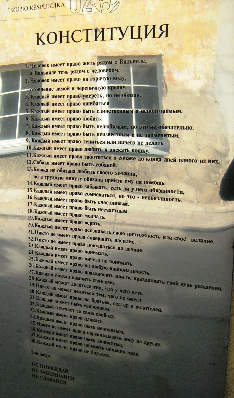 На всеобщее обозрение выставлена и Конституция Ужуписа, который позиционирует себя как «шуточное» государство.