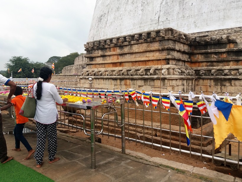 За это время я заметила такую странность. К ступе приносят очень много подношений – обычно цветы и фрукты. И это очень красиво, когда обычная каменная кладка расцветает, покрывается яркими красками. Но смотрители ступы Руванвелиссейя Дагоба безжалостно сгребают все подношения в мусорный бак, буквально спустя 10 минут после того, как их принесли молящиеся. Правда, муж мне разъяснил, что прихожан очень много, если всё оставлять, то начнет заводиться живность, могут прилететь пчелы, прибежать муравьи, поэтому надо стараться держать памятник в чистоте, при этом, не отнимая у посетителей право сделать это подношение.
