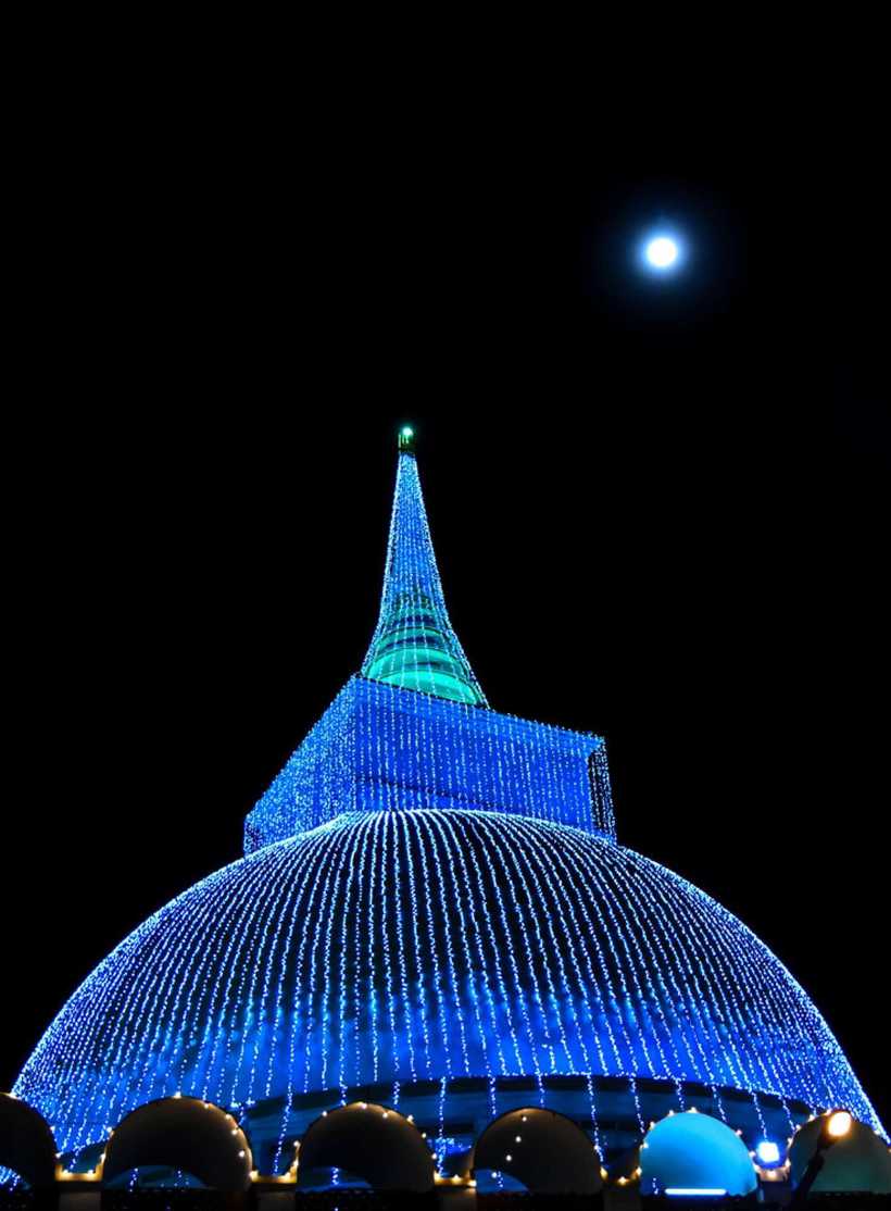 - Уникальность. Интересна конструкция Калутара Бодхия. Это единственный буддийский храм в мире, представляющий собой полую ступу. Обычно входа внутрь не бывает. Этот гигантский белоснежный купол виден из любой точки города и на подъездах к нему. На мой вкус, ещё более волшебным комплекс выглядит в вечернее время, когда он переливается гирляндами огней и отражается в глади реки. Всё это создает потрясающую, сказочную атмосферу. Если в храм приехать к 16-00, то вы успеете посмотреть его и при свете дня, и на закате.