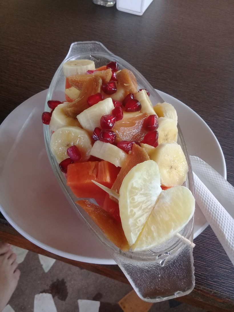 Вдоль пляжа тянется вереница небольших кафешек, еда там вкусная и сравнительно недорогая. Дешевле только в заведениях для местных, где я есть точно не рискнула бы. Стакан свежевыжатого сока стоит около 100-120 рупий, тарелка жаренного риса с овощами и яйцом - около 150, с курицей или морепродуктами - 180-200.