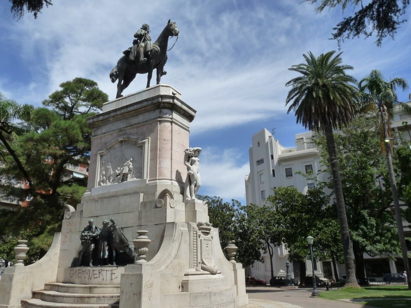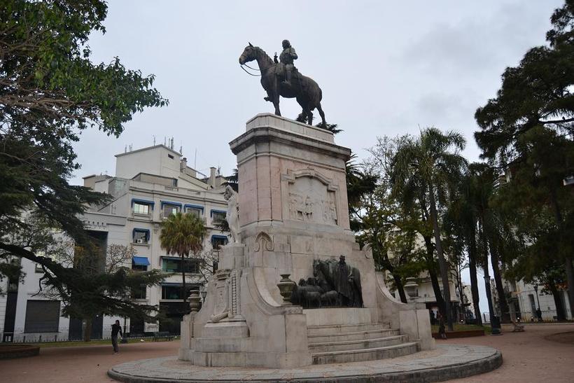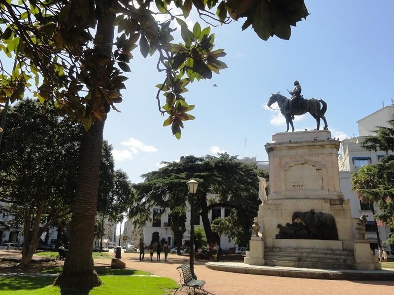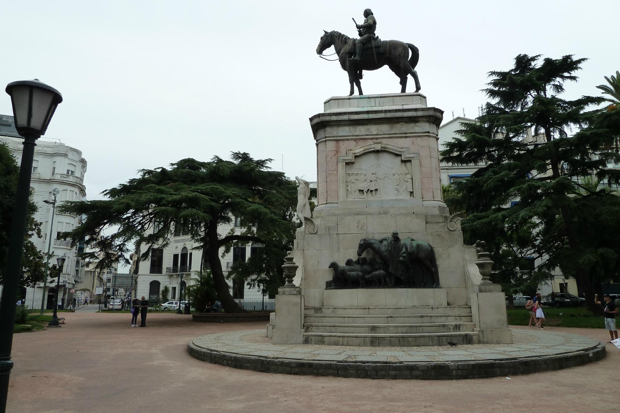 Что делать. Отдыхать в тени деревьев. Местечко просто создано для безмятежного отдыха. Центр площади превращен в сквер. Я моментально оценил его чистоту и красоту. Сочетание газонов с изумрудной травкой, множества скамеек и развесистых крон, дающих защиту от солнца, создавало убийственный эффект. Я не смог удержаться и, бросив все намеченные дела, уселся неподалеку от памятника каким-то героическим свершениям. Уругвайцы обожают ставить памятники в самых разных местах. Мне порой казалось, что их площади вылупляются на свет сразу с памятником в центре. Площадь Забала могла бы остаться мирным сквером, но в ее центре появился монумент в честь основателя Монтевидео, губернатора провинции Ла-Плата Бруно де Сабала.