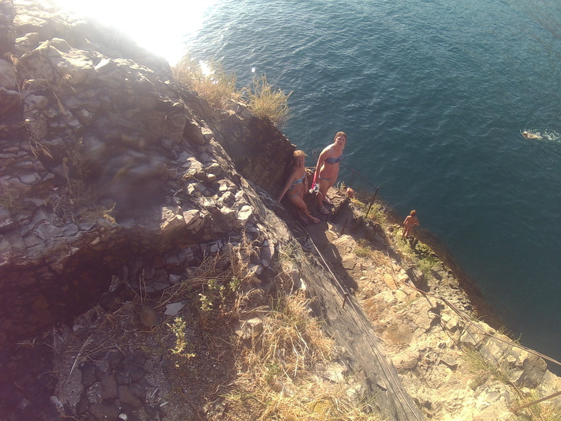 Наверное, что больше всего настораживало – это спуск. Чтобы попасть на пляж Фиолента, а он, как выяснилось, называется Яшмовый(кстати, очень известный, благодаря встречающимся ярким минералам среди серой гальки) , нужно преодолеть 800 ступенек. Но кого это останавливало? Значит, выйдя на остановке «Монастырь» пройдя вперед пару метров, повернув направо, пройдя до конца улицы через старые ржавые ворота советских еще времен, поворачиваем налево и идем до Свято-георгиевского монастыря, где находится смотровая площадка. Отсюда открывается потрясающий вид на море и начинается спуск. И тут у тебя начинает сносит голову от всей этой безумной красоты. Вот просто видишь и офигеваешь, стоишь как вкопанный, ощущая себя маленькой песчинкой на краю вселенной. Так что спуск уже не кажется таким непреодолимым. Тем более по пути есть много скамеечек, где можно передохнуть. А также прикупить пирожков, малинки, клубнички, орешков, если необходимо срочно подкрепиться.