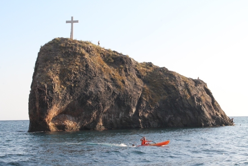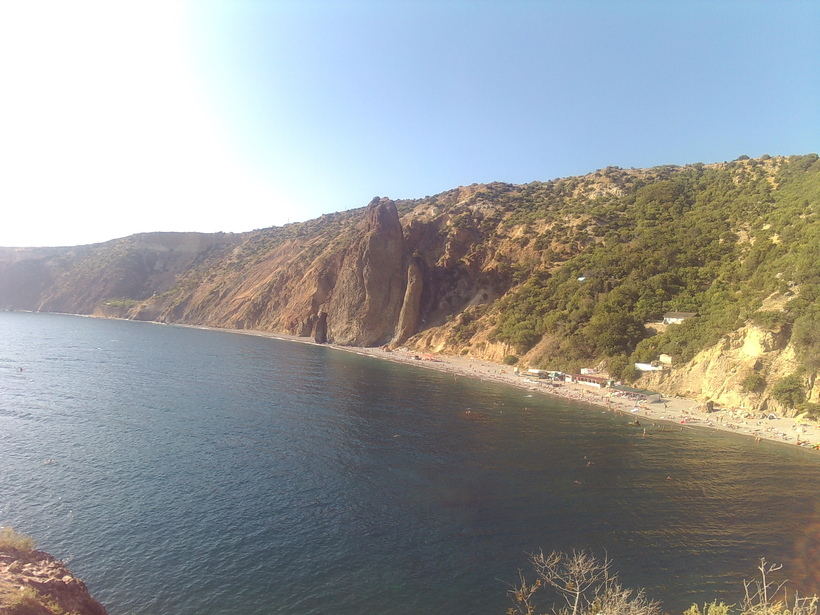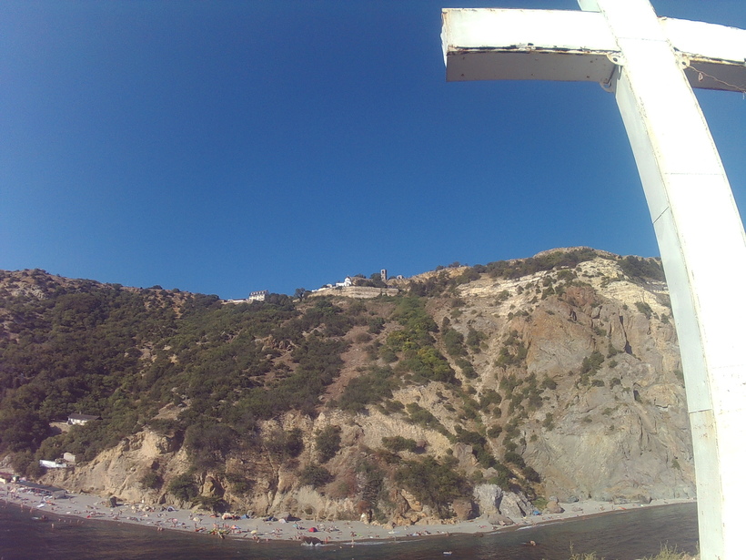 Внизу: пляж- галечный, протяженностью примерно 10 км, в окружении вздымающихся в небо скал, вода – чистейшая, изумрудная. Особенно, когда был , штиль. И открывается прекрасный вид в море на скалу Святого Явления. Название и скалы и монастыря обьясняют легендой, согласно которой потерпело кораблекрушение греческое судно. И мореходы так усердно молились Богу о спасении, что к ним явился Великомученик Георгий и сказал, что жизнь моряков будет спасена. Моряки смогли доплыть до скалы. Впоследствии на ней был установлен крест. До скалы с пляжа где-то метров 200. Доплыть не так сложно, тем более в воде встречаются большие камни, на которых можно постоять- отдохнуть, понырять с маской. Но плыть лучше в спецобуви, так как наверху очень колко. По галечному пляжу я люблю ходить. Но там было больно. Со скалы , конечно, тоже откываются такие виды, что просто можно сидеть и созерцать бесконечно, что и сделали наши путешественники-попутчики в этом году. Уплыли-взобрались, и все зависли там на два часа.