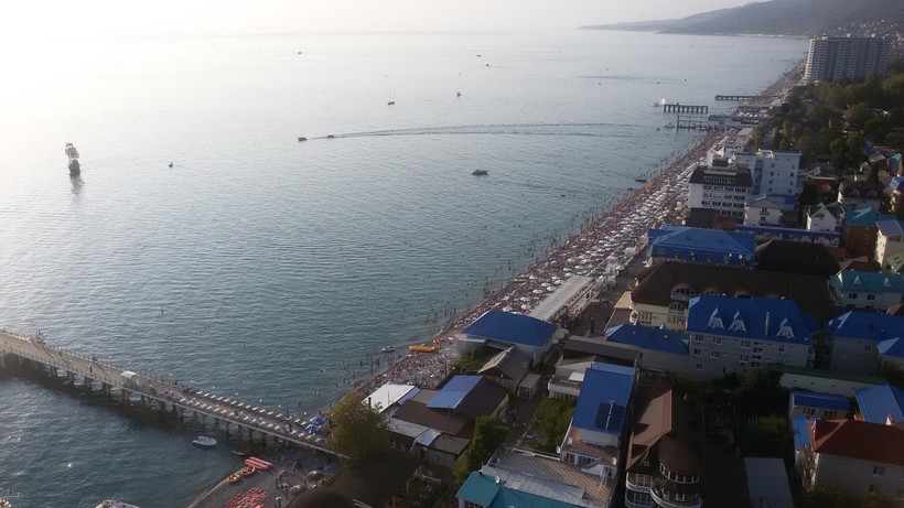 И вот, колесо тронулось. Слушайте, даже когда оно поднялось на небольшую высоту, у меня уже сердце замерло от великолепия вида лазаревского сверху. Что уж говорить о том, когда колесо поднялось выше. Конечно, виды открываются великолепные. Я обожаю море, его волны, внешний вид, синеву в ясную погоду, поэтому я не могла оторвать глаз от этой потрясающей картины - белые барашки волн, солнечные блики, бирюза - просто непередаваемая красота.