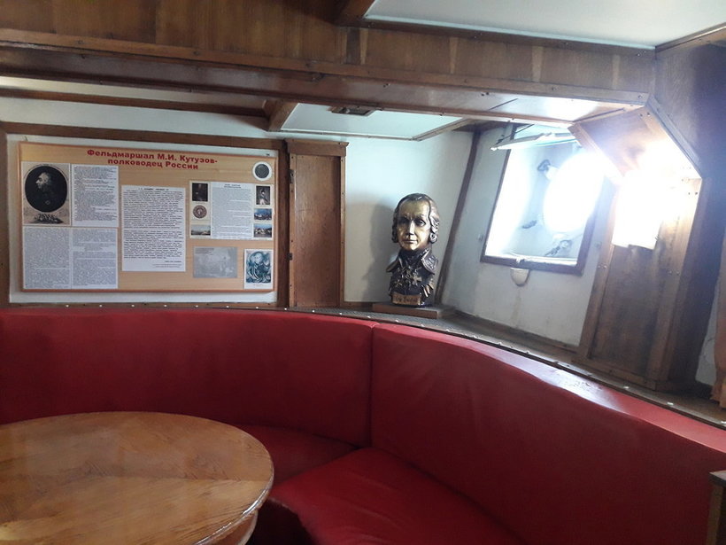 Когда мы оказались в кают-компании, ощущение времени смешалось. Оформление почему то в моем восприятие смиксовалось в каюту жюльверновского корабля «Дункан» и актового зала.
