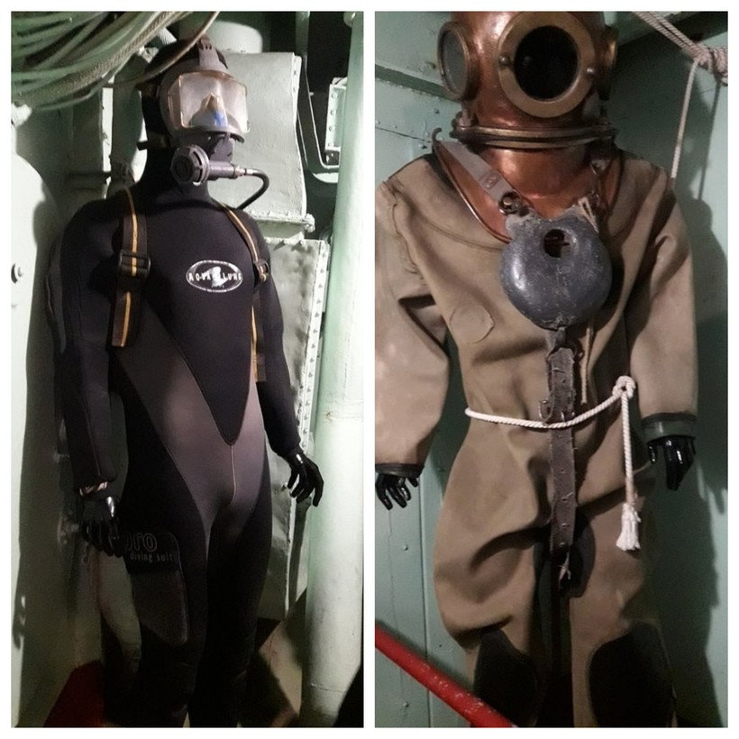 Низкие и узкие коридоры заставили меня задуматься о железной флотской дисциплине о отличной организации жизнедеятельности на этом корабле. Когда то в таких условиях, где наша группа сталкивалась носами, люди выполняли распоряжения четко и быстро. Команда при этом составляла более тысячи человек. Итак мы, стараясь не споткнуться, преданно шли за экскурсоводом, без которого блуждали бы, как в лабиринте. Когда в стенах я заметила костюмы водолазов, то невольно вздрогнула. Так они похожи были на человечские фигуры, стоявшие у стены. Разные модели, каждый был расчитан на определенную глубину, заинтересовали всех.