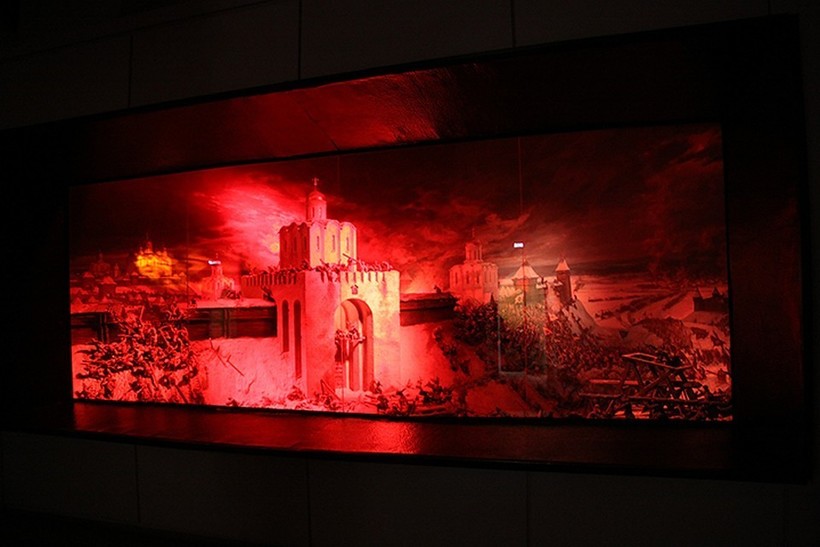 - Атмосферная экспозиция. Посвящена она роли Владимира в военной истории, и я уже оставлял на этом сайте отзыв непосредственно о ней. Здесь же еще раз отмечу, что каждые 20 минут свет в главном зале гаснет, диорама подсвечивается и эпичный голос вещает о мрачных событиях 1238 года.