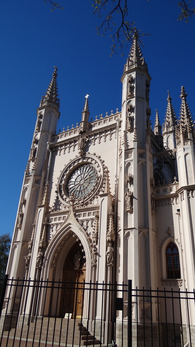 Из построек мне больше всего запомнилась готическая часовня Александра Невского, больше похожая на уменьшенную копию какого-нибудь европейского костела. Выполнена она на европейский манер, так как этот парк был построен по приказу императора Николая I для его супруги Александры Федоровны, которая по происхождению была немкой.