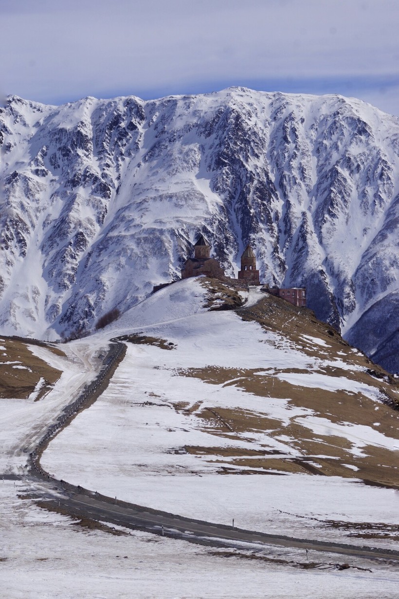 Я безумно люблю горы, поэтому из Тбилиси мы на один день отправились в Казбеги или в поселок Степанцминда. Самая знаменитая достопримечательность здесь - это церковь Гергети. Церковь это действущая и находится она у подножия горы Казбек.