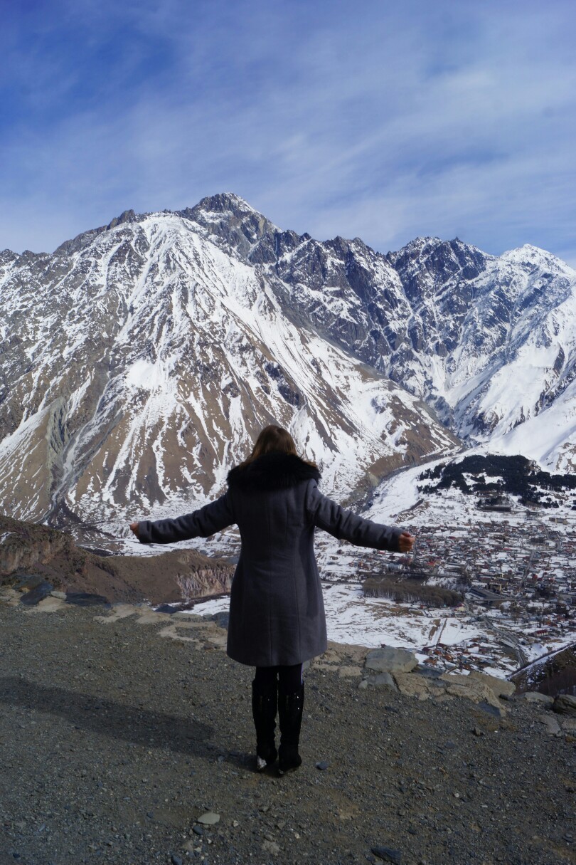 Церковь, напоминаю, действующая и можно зайти, главное не забывать, что голова должна быть покрыта и должна быть юбка у женщины и брюки у мужчины, но так же, как и во всех церквях России, при входе есть платки и ткань для того, чтобы повязать юбку. Но самое красивое это вид - с одной стороны гора Казбек, а с другой вид на поселок и главное мои любимые горы в еще шапочках снега, очень бы хотела приехать сюда летом или осенью и посмотреть на все эти пейзажи в другое время года.
