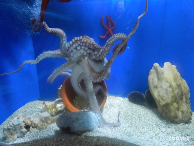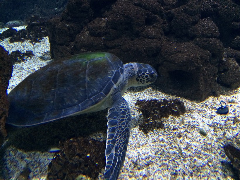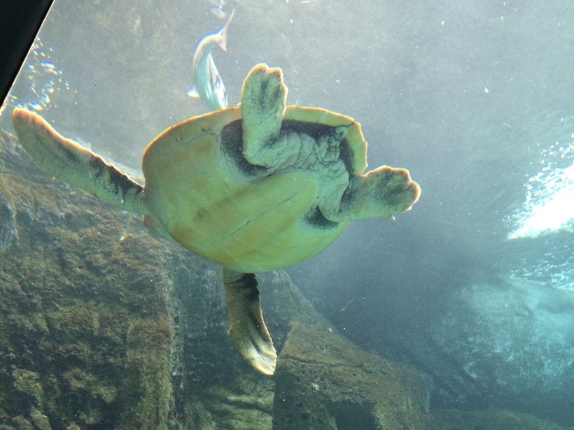 Внутри помещение маленькое, несколько аквариумов с интересными рыбками, муренами, осьминогом и один большой открытый с черепахой.