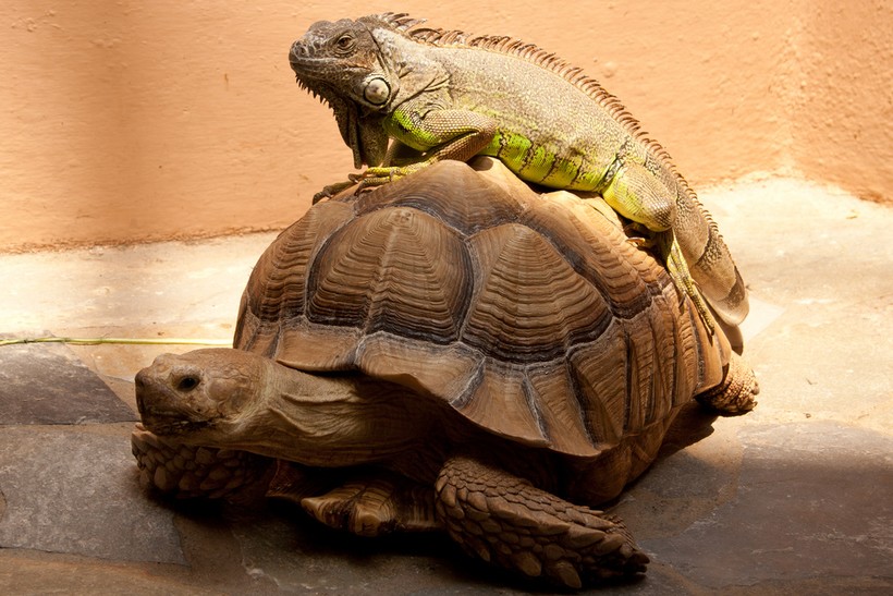 Всего в аквариуме обитают несколько видов черепах – морских и сухопутных, питоны, змеи, игуаны, хамелеон, агама – в общем, масса интересных существ. И самое прекрасное, что всех их можно трогать и фотографировать. Животные привыкли к людям, поэтому очень контактны и дружелюбны. Можно повесить себе на шею огромного тяжелого питона, можно гладить здоровенную игуану или наблюдать, как по твоим ногам ходит гигантская черепаха.