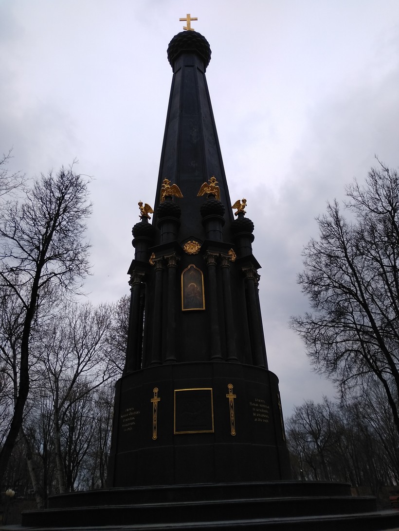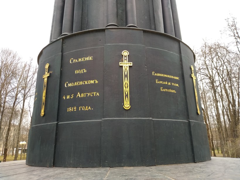 Памятник защитникам Смоленска 1812 года - сделан на подобии часовни увенчанной куполом с золотым крестом. Памятник изготовлен из чугуна. На гранях нижнего яруса золотом высечены имена участников военных действий. Чередующиеся со стилизованными изображениями мечей.