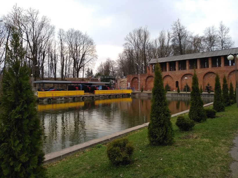 В парке можно подойти к фрагментам крепостных стен, есть даже такая, у которой не стали закладывать кирпичом торец, как сделано у некоторых других стен, встречающихся в городе, и с торца видно внутреннее устройство стены (открытое пространство для перехода внутри стен).
