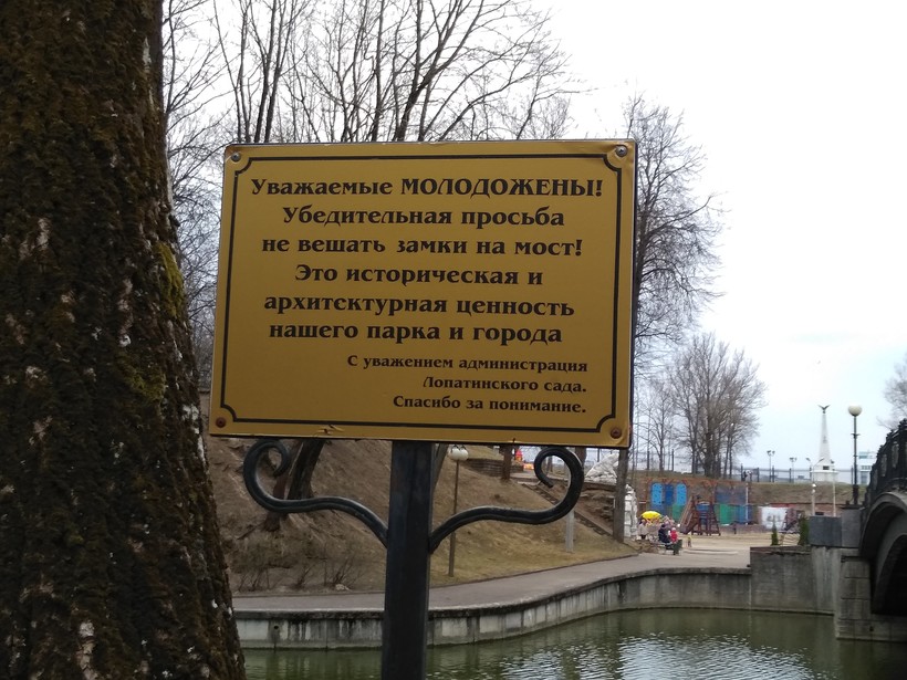 Через пруд перекинут мост с ажурными ограждениями. Мост поцелуев. Видно он ранее был очень популярен у молодоженов для прикрепления замков, и видимо этих замков здесь было столько, что даже появилась предупреждающая табличка с настоятельной просьбой замки на мост не вешать.