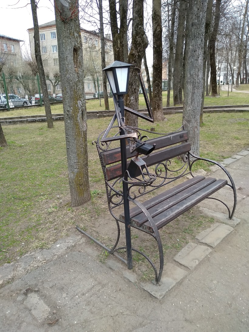 В саду вдоль водоема установлены лавочки. Необычные, каждая декорирована фонарем-скульптурой. В зависимости от расположения лавочки скульптура тоже имеет свой характер.