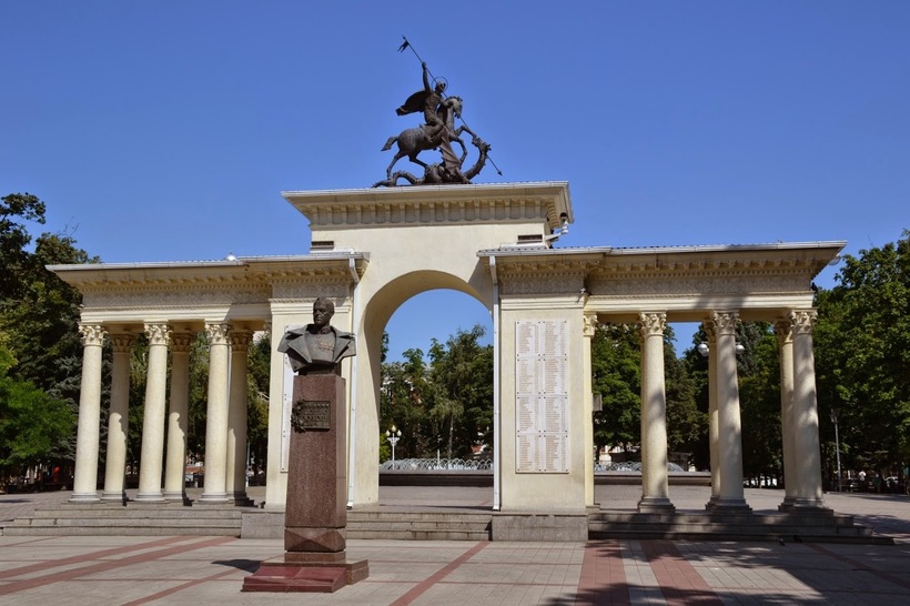 Пройдя Первомайский сквер, в котором есть бесплатный вай-фай, и часовню Александра Невского, мы подошли к мемориальной арке «Ими гордится Кубань».