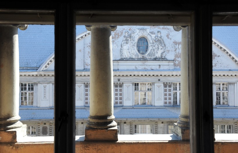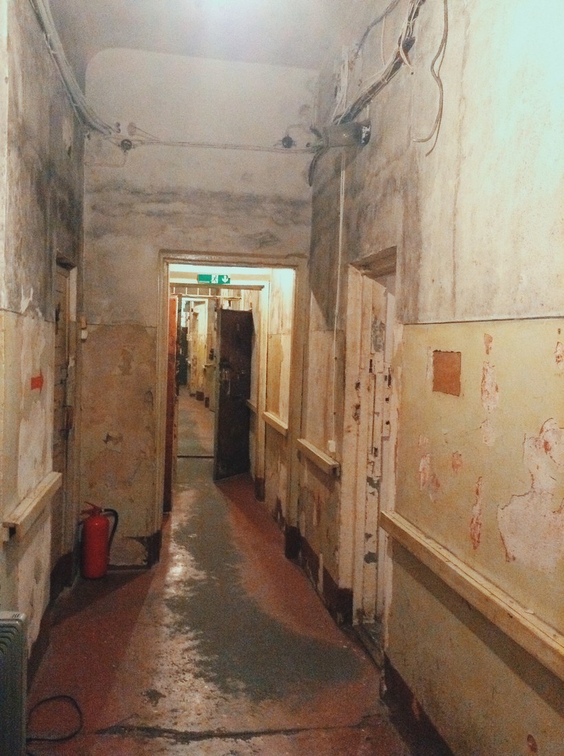 Прежде всего – сам дом. Скрипучие полы, покрытый красными коврами. Тусклые лампочки. Исторический, годами не менянный паркет. Часть окон немытая – подозреваю, намеренно. Вид на здания на противоположной стороне – как взгляд из камеры заключения на клочок синего неба. В коридорах – ободранные стены, а то, что не ободрано, выкрашено краской исключительно тошнотного цвета.