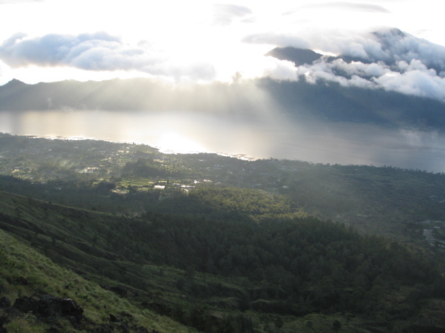 На этот раз тумана не было. Священный вулкан Агунг был виден очень хорошо. Озеро Батур, которое возникло в кратере потухшего вулкана блестело под восходящим солнцем. Домики, зелень, дороги....Такое чувство, что смотришь на огромный макет с высоты.