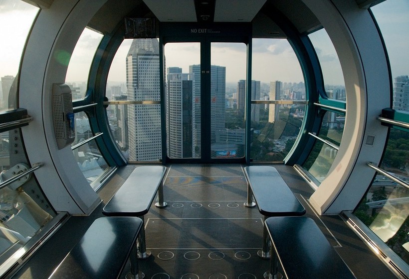 Когда же подошла моя очередь, то я зашла и начала осматриваться. В принципе, всё выглядит современно, однако стекла кабинки оказались несколько грязными. Быстро отбросив свой взгляд от разводов, я начала рассматривать картину города. С высоты мне удалось разглядеть Гарденс бай Бэй (ландшафтный парк), музей науки и искусства в виде цветка, знаменитый Сингапурский театр...