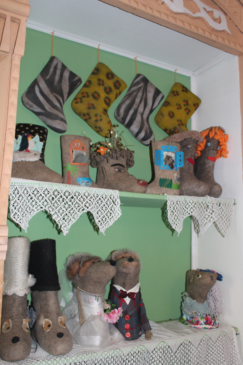Сам материал для изготовления этой обуви на ощупь теплый и приятно согревающий. И самый подходящий для изготовления мышей разного вида!!! Я себе и друзьям таких мышек купила. В музее помимо очень подробного рассказа о стадиях производства валенок есть небольшая экспозиция обуви прошлых времен. Во время экскурсии рассказывают о названии и истории конкретного вида обуви.
