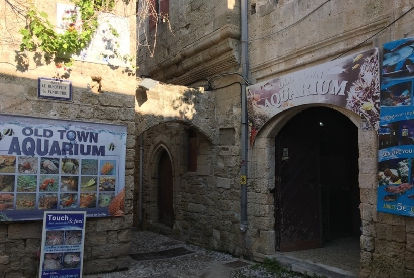 Аквариум Enydreio Mouseio также известен как Old Town Aquarium. Находится он практически в самом сердце старого города, в одном из средневековых зданий. Вход туда украшает недвусмысленная вывеска, которая и привлекла мое внимание.