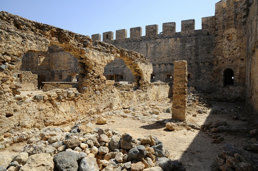 Замок представляет собой каменную коробочку. Вход стоит 2 евро – в принципе, если б брали больше, мы, может, и не пошли бы, потому что мы уже бывали, например, в венецианской крепости в Ретимно, которая мне очень нравится, и после неё Франгокастелло, конечно, не производит такого грандиозного впечатления. Однако моя любовь к средневековым замкам настолько велика, что упустить этот объект я просто не могла. Но если бы там действительно брали большие деньги за вход, то, наверное, мне бы хватило осмотреть его со всех сторон и пойти себе восвояси. А так мы заплатили по 2 евро, зашли внутрь.