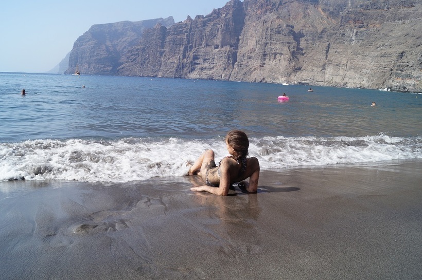 Второй немаловажный момент – это черный вулканический песок. Конечно, это не единственный пляж на Тенерифе с таким песком, ведь все-таки это вулканический остров, но некоторые пляжи острова им похвастаться не могут, так как туда зачем-то везут классический желтый песок с материка. Говорят, что черный песочек благоприятно влияет на здоровье и полезно просто лежать на нем, без шезлонгов и полотенец. Однако ни в коем случае не надевайте светлый купальник – потом не отстираете. Ну и, конечно, черный песок сильно нагревается – пока идешь от лежака до моря, можно не на шутку обжечь пятки. Поэтому мы обычно бегали до моря на перегонки)