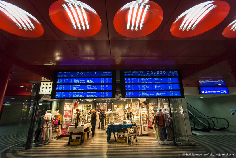 Что мне очень понравилось: вокзал довольно хорошо адаптирован для людей с ограниченными возможностями. Существуют различные лифты с кнопками вызова, пандусы, таблички с выпуклым рисунком. Также для того, чтобы в час пик не создавался хаос, на полу находится разметка, которая разделяет потоки людей. Помимо этого на вокзале работают электронные табло информации на чешском, немецком и английском. Есть камера хранения, магазины, кафе.