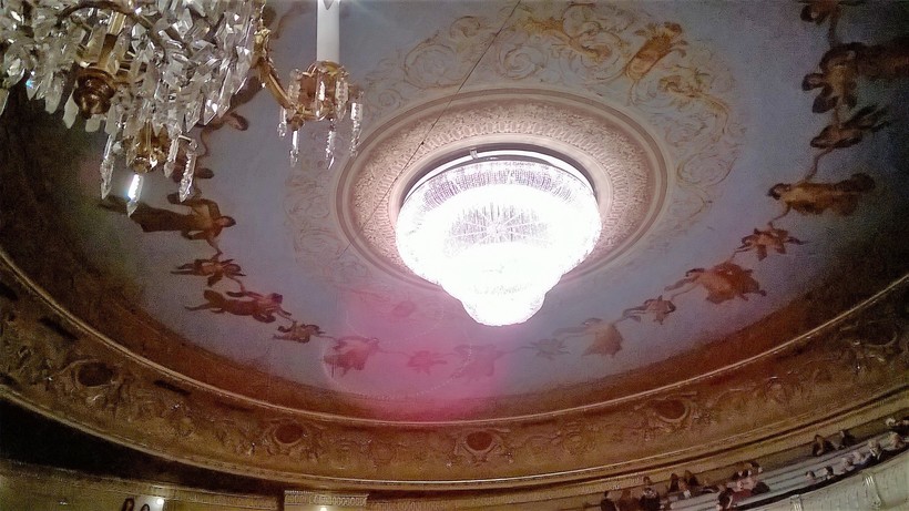 Отдельных слов, конечно, заслуживает сам зал исторической сцены, наполненный духом прошлого: роскошная лепнина золотого цвета по всему периметру зала, мастерски расписанный потолок, светильники, имитирующие канделябры со свечами, и, конечно, старинная трехъярусная люстра, сохранившаяся еще со второй половины 19 века. В общем, даже если представление на сцене не заинтересует, напрасным поход сюда точно не будет.
