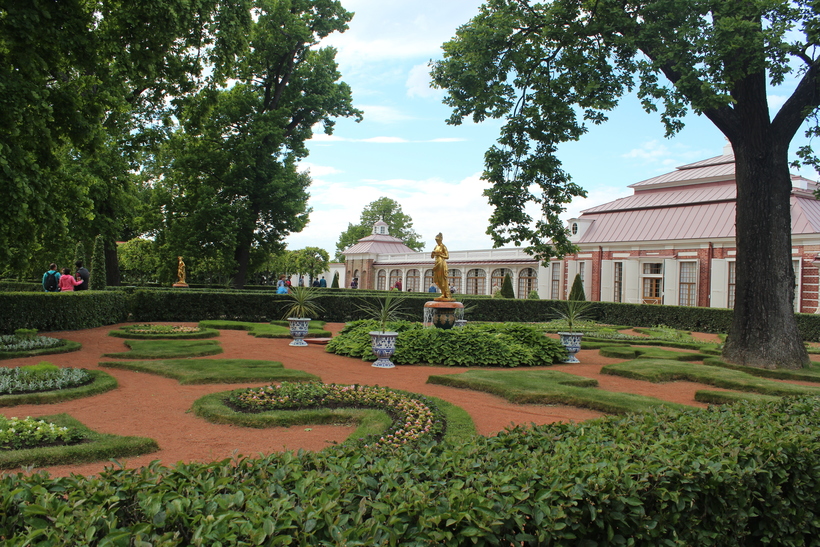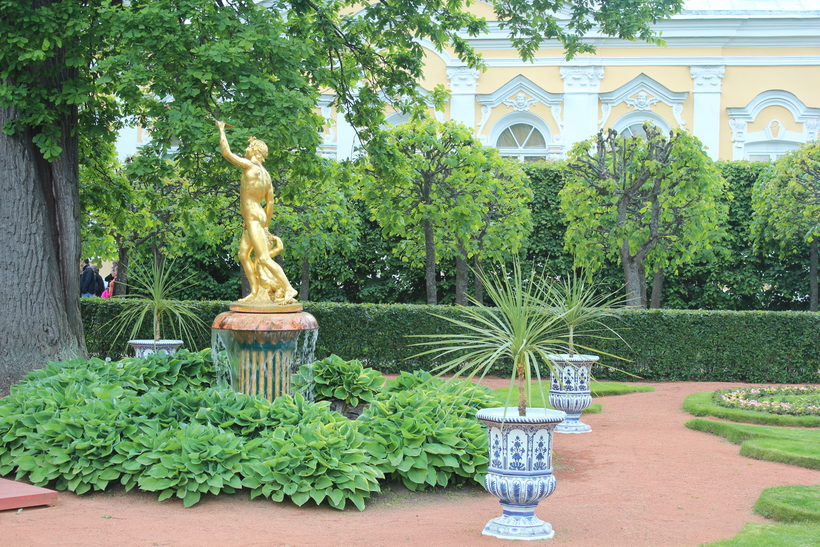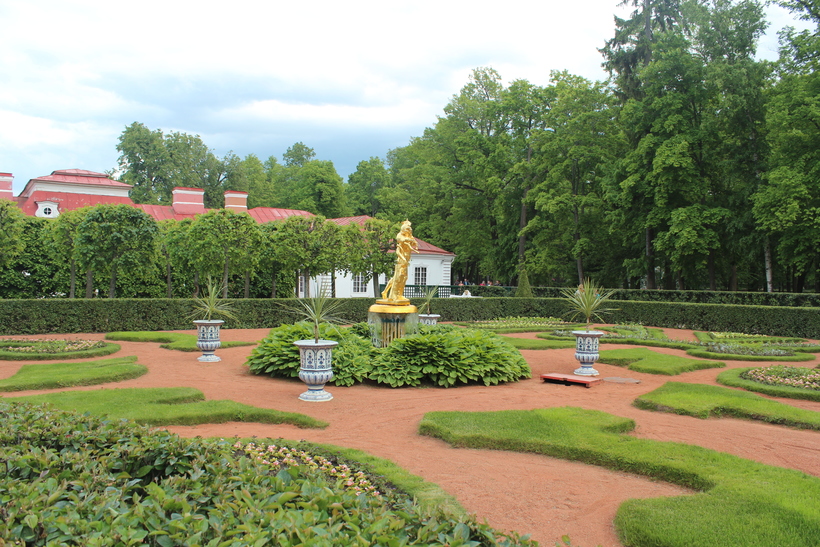 Вокруг дворца разбит парк. Такой парк в парке))) Установлены позолоченные скульптуры. Небольшие фонтаны. И что особенно интересно – уличные вазы. Не могу сказать из какого материала они сделаны, но на вид тонкая керамика в стилистике гжели. Роспись синего цвета на белом фоне. Но это может быть дань все тому же голландскому стилю (голландские изразцы в таком цвете изготавливались), который очень любил Петр первый!