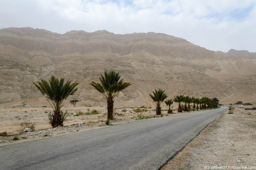 Мы проезжали путь из города Хадера через Тель-Авив, Иерусалим и после этого попали на Шоссе 90. Наш путь по нему пролегал к Мертвому морю. Если же поехать дальше, то попадаешь в Эйлат. Дорога нелегкая. Чтобы нам попасть, например, Хадеры в Эйлат путь должен был составить часов пять. И дело не в том, что дорога очень дальняя. Само шоссе 90 целиком длинной всего 480 километров. Бывает, по Московской области за день столько можно наездить. Дело в том, что поездка по шоссе сама по себе очень непростая. Много участков с серпантинами. Эти серпантины пролегают через песчаные горы пустыни, которые сплошняком лежат по пути справа и слева от дороги. Получается, едешь за рулем и не можешь порой ориентироваться толком, глаза настолько устают от однообразной картины со всех сторон. Нет ни домов, ни зелени. Просто пустыня вокруг. Плюс к этому добавляется перепад низин и высот. Мертвое море это самая низкая точка на Земле. Ее уровень составляет 430 метров ниже уровня моря. Это еще больше усложняет путешествие по Шоссе 90. Дело в том, что в районе Мертвого моря, по мере спуска к нему, начинает закладывать уши и возникают давящие ощущения в голове, а воздух вокруг настолько разряженный, что в лобовом стекле стоит легкая пелена. Хотя мы путешествовали на двух машинах, и при обмене впечатлениями выяснилось, что не у всех были такие ощущения. Соответственно, есть вероятность, что вам будет легче в дороге.