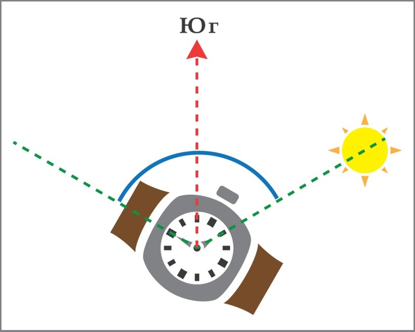 - повернитесь так, чтобы часовая стрелка прямо указывала на Солнце;