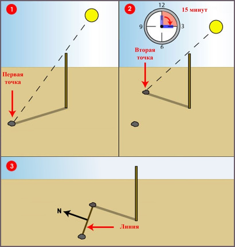 По мере движения тени нужно выкладывать след камушками, откуда первоначально указывала палка. Таким образом, продвижение тени будет идти с запада на восток, от первого камушка до последнего. А перпендикуляр к полученной линии запад-восток будет линия север-юг.