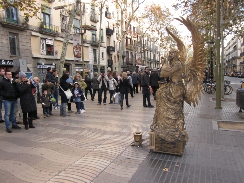 Такого вы не найдете больше нигде! Кого здесь только нет: королевы, индейцы, ангелы, клоуны, животные и насекомые. Если не знать, что скульптуры живые, можно испугаться от неожиданности! Интересный факт: для того, чтобы стать "живой скульптурой", нужно получить сертификат и разрешение! Что-то вроде лицензии на подработку. На улице Рамбла не так-то просто оказаться.