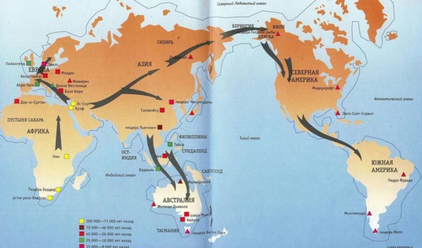 Исчезли животные, служившие основной пищей, а так как земледелия еще не существовало, человек начал расселяться по обширным территориям. Это случилось в 2 этапа: около 65000 лет назад, когда люди проникли в Азию, и 42000 лет назад, когда наши предки стали осваивать Европу.