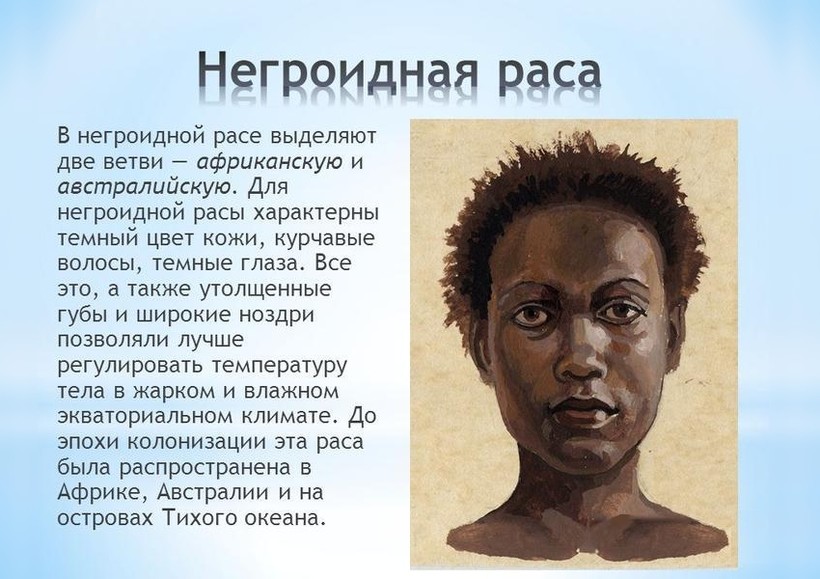 Люди живут на территориях с разным климатом. В результате долгой адаптации к погодным условиям внешность человека меняется. Именно потому выделяются расы — это объединение людей со схожими чертами внешности. Например, а Африке из-за жаркого климата сформировалась негроидная раса. Ее представители обладают черной кожей, широким носом и кудрявыми волосами. На территории Азии живет монголоидная раса. Люди этой расы отличаются узким разрезом глаз и низким ростом. Представители европеоидной отличаются светлой кожей и высоким ростом, а австралоидной — выдвинутой вперед нижней челюстью.