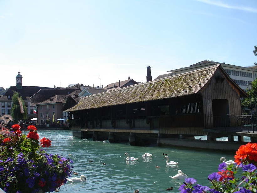 Особенно мне понравилась главная площадь. На ней нашлось место ратуше с характерными для Швейцарии аркадами, и нескольким украшенным флагами симпатичным домам, чьи подоконники были украшены цветами. Это вообще типичная черта для центра Туна, его жители обожают размещать горшки с растениями на балконах и подоконниках. Пройдясь по ближайшему окружению площади, мы увидели, что так поступают почти все поголовно горожане.