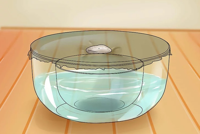 - Далее требуется закрепить пакетик по краю большой миски скотчем, а сверху положить камушек.
