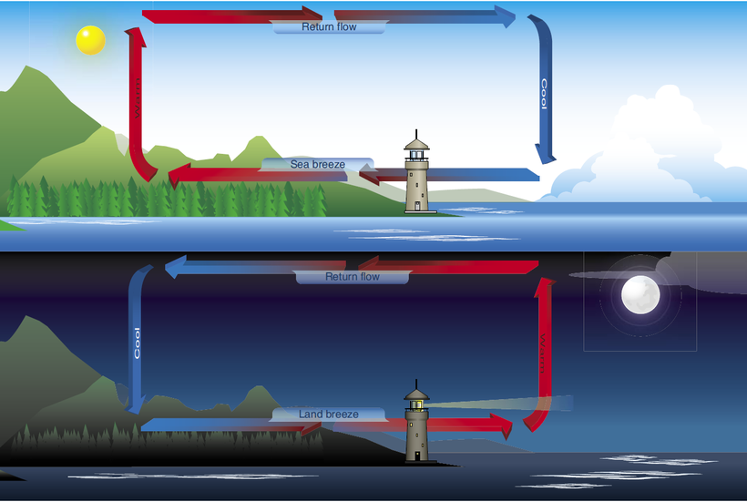 На побережье водоемов в жаркий летний день все когда-нибудь чувствовали приятный легкий ветерок. Дневной бриз или, как его называют, морской, за то, что влажный поток воздуха движется с морского пространства на берег, освежает, дарит легкость дыхания. Ночной бриз или береговой меняет направление и несет воздушный поток от разогретого берега к более прохладной водной поверхности.