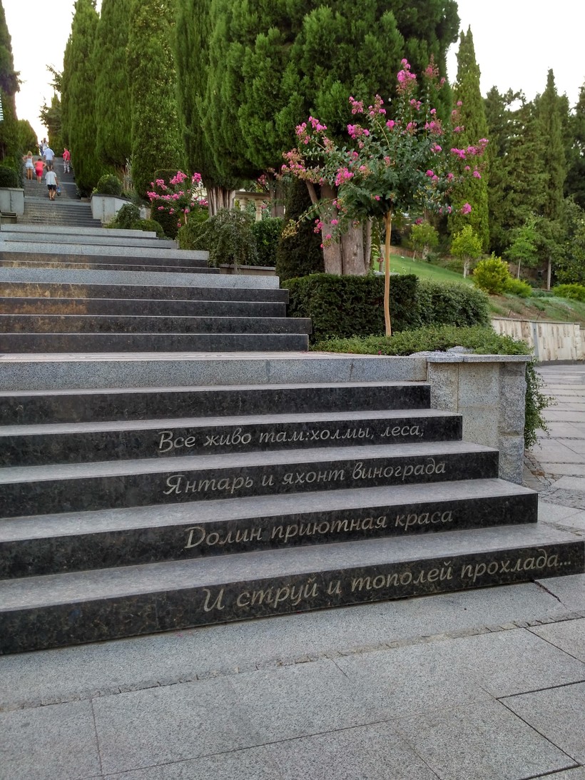 При входе в парк сразу попадаете на широкую дорогу, которая продолжается лестницей, спускающейся к морю.