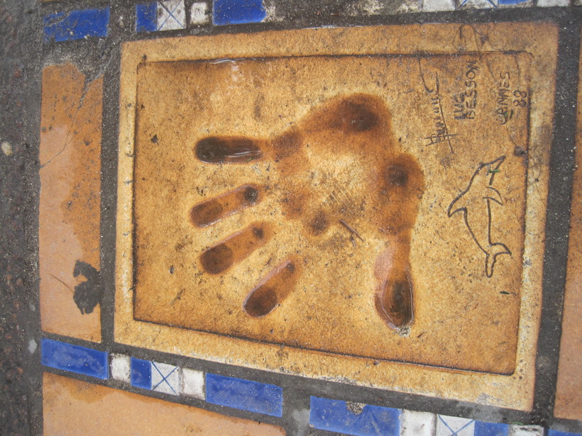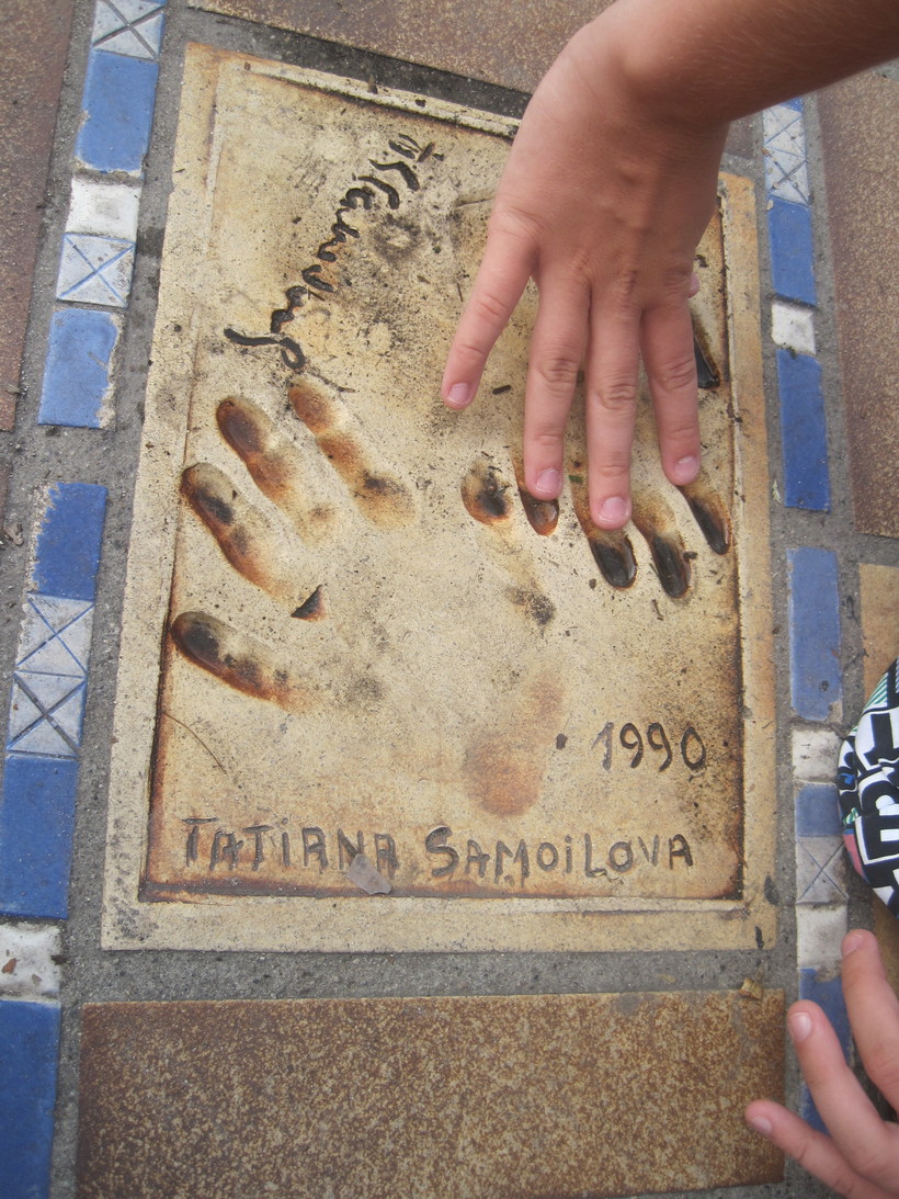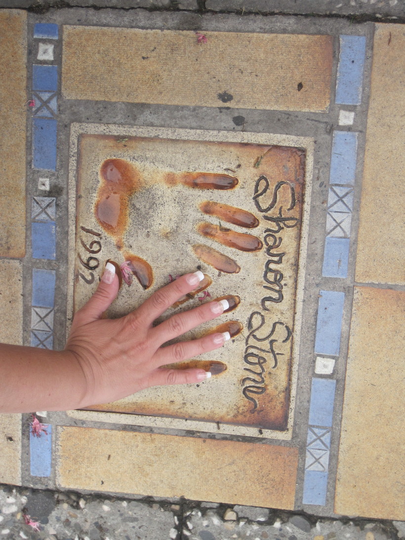 Отпечатки звездных рук занимают приличную часть площади перед дворцом. Туристов здесь было предостаточно, именно по их наличию я и определила нужное место. Вот здесь было очень интересно ходить, рассматривая отпечатки рук и радуясь, когда встречалась знакомая фамилия. Шарон Стоун, известная полулярная голливудская актриса, здесь была тоже одной из самых популярных. Около плитки с её отпечатком руки было несколько человек. Я тоже терпеливо подождали и сделала фото на память.